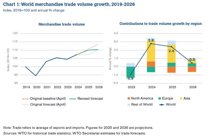 GENEVA, Switzerland – Global merchandise trade outpaced expectations in the first half of 2025, driven by increased spending on AI-related products, a surge in North American imports ahead of tariff hikes, and strong trade among the rest of the world. In response, WTO economists raised the 2025 merchandise trade growth forecast to 2.4 percent (up from 0.9% in August).