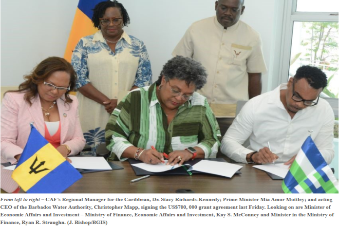 BRIDGETOWN, Barbados, (GIS) – The signing of a grant agreement between the government and the Development Bank of Latin America and the Caribbean (CAF) for US$700,000 will support the Barbados Water Authority (BWA) with the reduction of non-revenue water wastage.