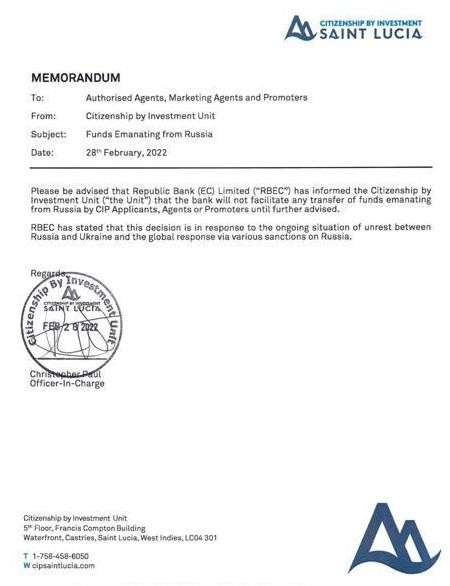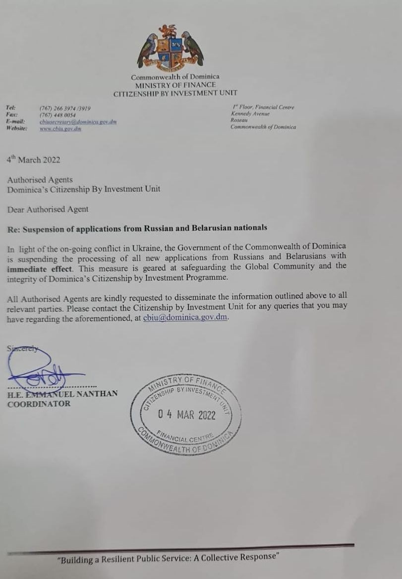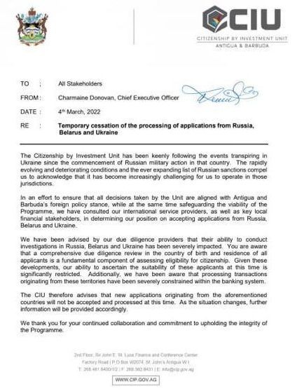 In the light of Russian aggression on Ukraine, Antigua and Barbuda, Dominica and Saint Lucia with immediate effect are seeking to protect the integrity of their respective programs, and safeguards to international exposure, amid the risk of global sanctions, that may include revocation of CARICOM passports to Russian oligarchs and associates’.