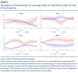• Climate change has become an important factor for fiscal policy, debt sustainability and sovereign risk. This blog post shows how climate shocks can push up bond yields, especially for highly indebted and developing countries.