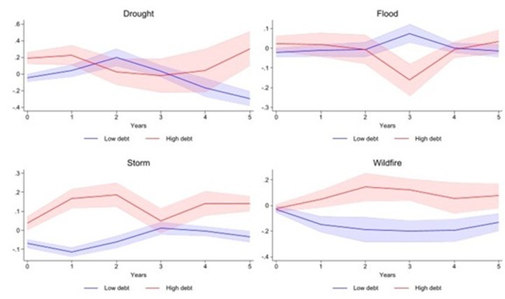 Droughts also produce sizeable effects, but with a differing pattern depending on debt levels. In low‑debt countries, yields rise sharply to around 0.2 log points in the second year before declining abruptly, while in high‑debt countries the response peaks at a similar level but more quickly. The broader picture remains clear. Low-debt countries typically face modest and temporary increases in borrowing costs after climate shocks. High-debt countries experience larger and more persistent effects. This is particularly evident in the case of storms and droughts, where fiscal vulnerabilities amplify the perceived risks.