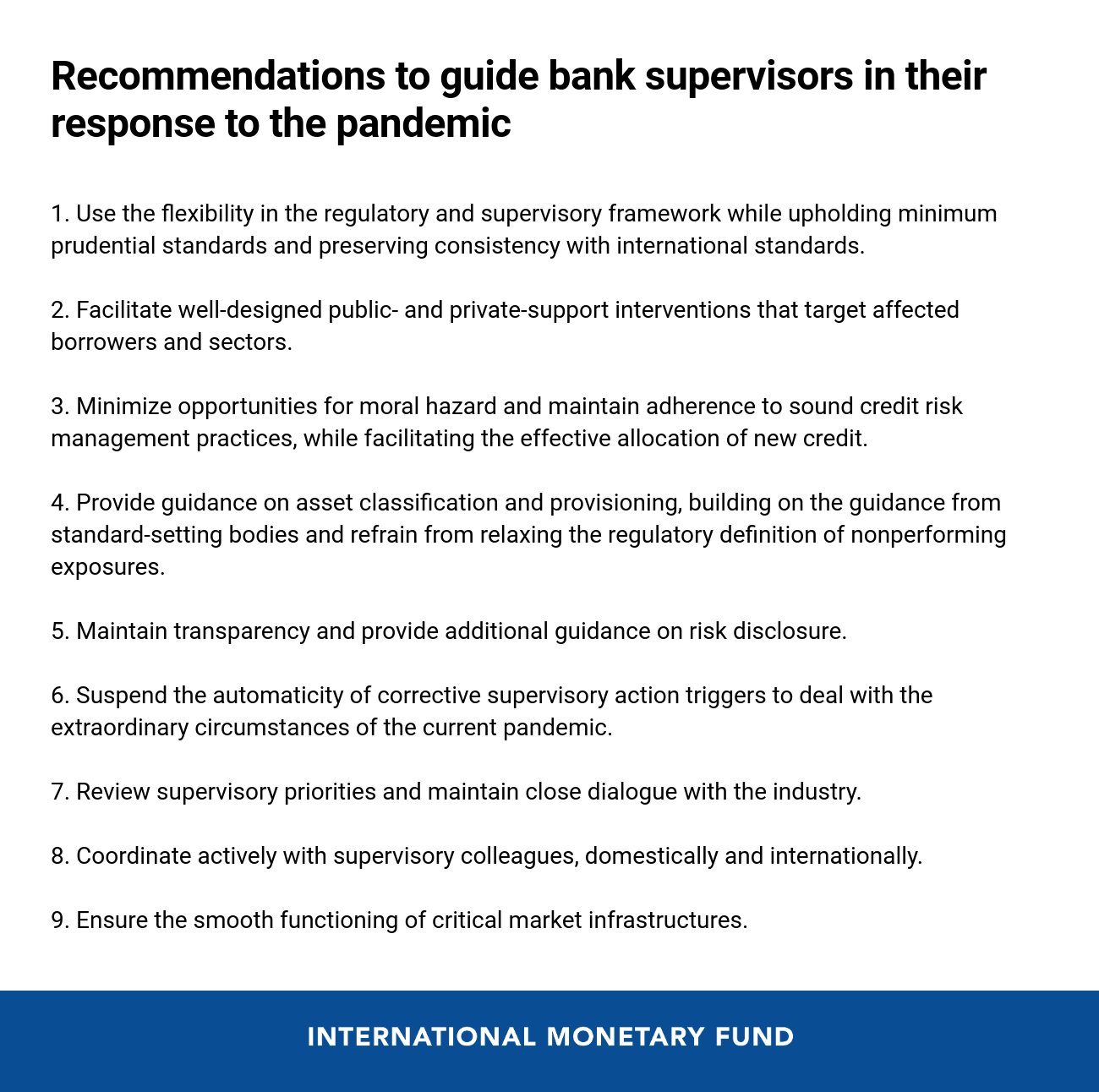We provide nine recommendations that recognize the continued effort to support the immediate needs of the real economy, while ensuring financial stability. They encourage national authorities to employ the embedded flexibility of regulatory, supervisory, and accounting frameworks, while upholding internationally-agreed minimum regulatory standards and supervisory principles. Abandoning such principles could sow the seeds of future risks that potentially undermines the medium-term soundness and health of the banking system.