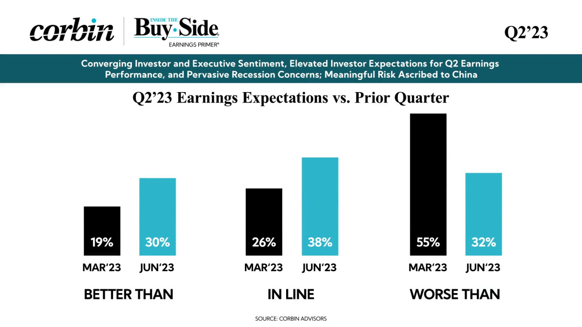 HARTFORD, Conn.–(BUSINESS WIRE)–Corbin Advisors, a strategic consultancy accelerating value realization globally, today released its quarterly Earnings Primer®, which captures trends in institutional investor sentiment. The survey, which marks the 55th issue of Inside The Buy-side®, was conducted from June 12 to July 7, 2023, and is based on responses from 78 institutional investors and sell side analysts globally, representing ~$6.3 trillion in equity assets under management.
