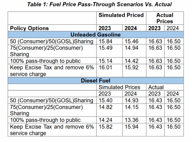 “A caring government could have shared the reduction in fuel prices, using either a 50/50, 75/25 sharing mechanism or 100 percent if it so desired,” said Descartes, as summarised in Table 1.