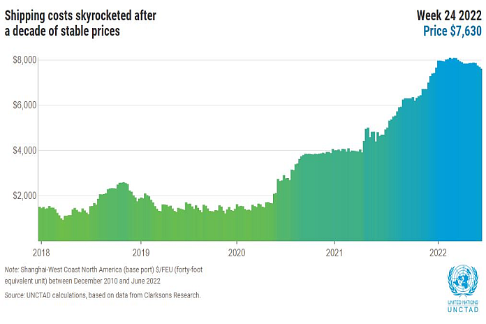 According to UNCTAD’s simulation model, a sustained surge in freight rates can lead to an increase in global consumer prices of 1.6 percent in 2023.