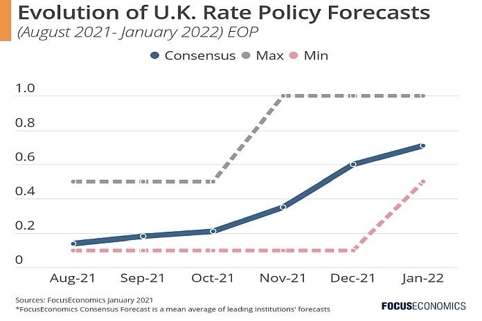 The majority of our forecasters have raised their projections for end-2022 monetary policy rates over the past month. FocusEconomics Consensus forecasts consisting of 44 analysts now expect the federal funds rate to end next year at 0.78 percent, with a maximum forecast of 1.25 percent and a minimum forecast of 0.25 percent. Moreover, our Consensus consisting of 35 analysts sees the BoE’s policy rate ending 2022 at 0.71 percent, with a maximum forecast of 1.00% and a minimum forecast of 0.50 percent.