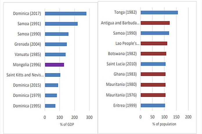 In terms of economic impact, the most severe storm ever, calculated on a per capita basis, hit Dominica in 2017, causing damage equivalent to 280 percent of the island’s GDP, according to the Emergency Events Database (EM-DAT).