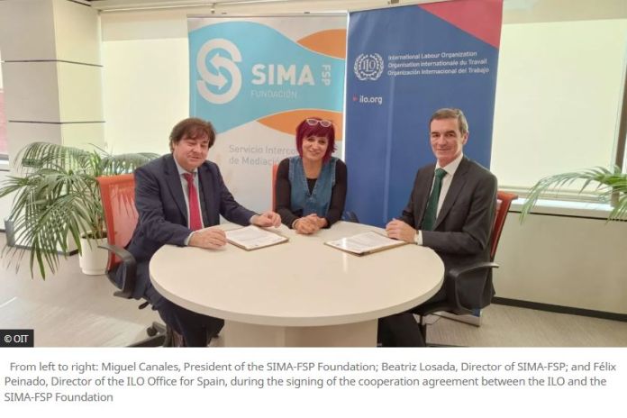 MADRID, (ILO News) – Enhancing knowledge of the autonomous and peaceful settlement of labour disputes and promoting training actions and programmes to support the professional development of labour mediators are the objectives of the cooperation agreement signed between the ILO and the SIMA-FSP Foundation.