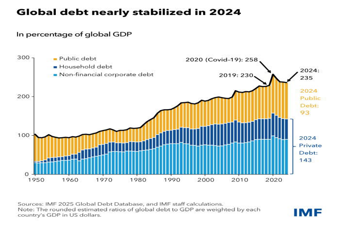 Total debt was little changed last year, just above 235 percent of global gross domestic product, according to the latest update of the IMF’s Global Debt Database.