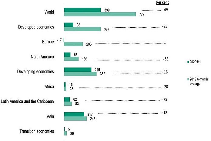 In the six months to June 2020, developing countries in Asia accounted for more than half of global FDI. Flows to economies in transition were down 81 percent due to a strong decline in the Russian Federation.