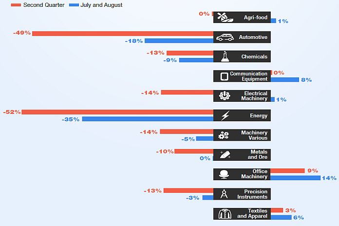 Year-on-year growth of developing nations’ exports improved from -17 percent in the second quarter to -6 percent in July, while those from developed nations increased from -22 to -14 percent.