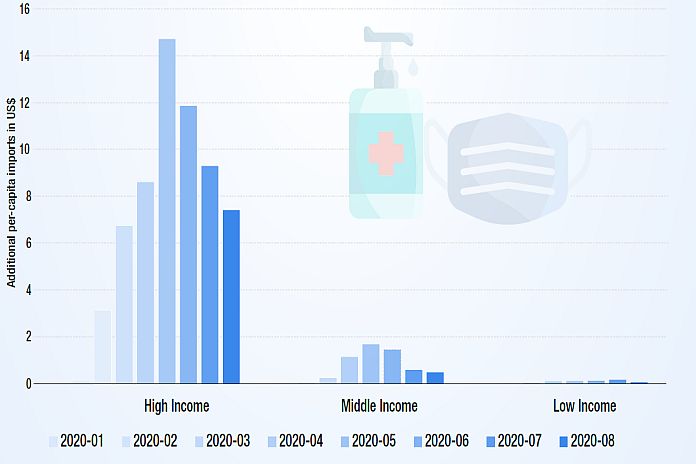 Since the outset of the pandemic, each resident of high-income countries has benefited on average from an additional $10 per month of imports of COVID-19 related products, compared with just $1 for people living in middle-income countries and a mere $0.10 for those in low-income countries.