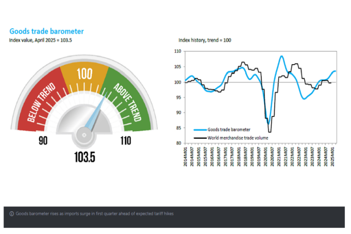 GENEVA, Switzerland – Global goods trade posted a strong uptick in early 2025 driven by importers frontloading purchases ahead of the anticipated higher tariffs; however, weakening export orders suggest that this momentum may not be sustained. The latest World Trade Organization (WTO) Goods Trade Barometer rose to 103.5 — up from 102.8 in March, while the forward-looking new export orders index fell to 97.9, pointing to weaker trade growth later in the year.