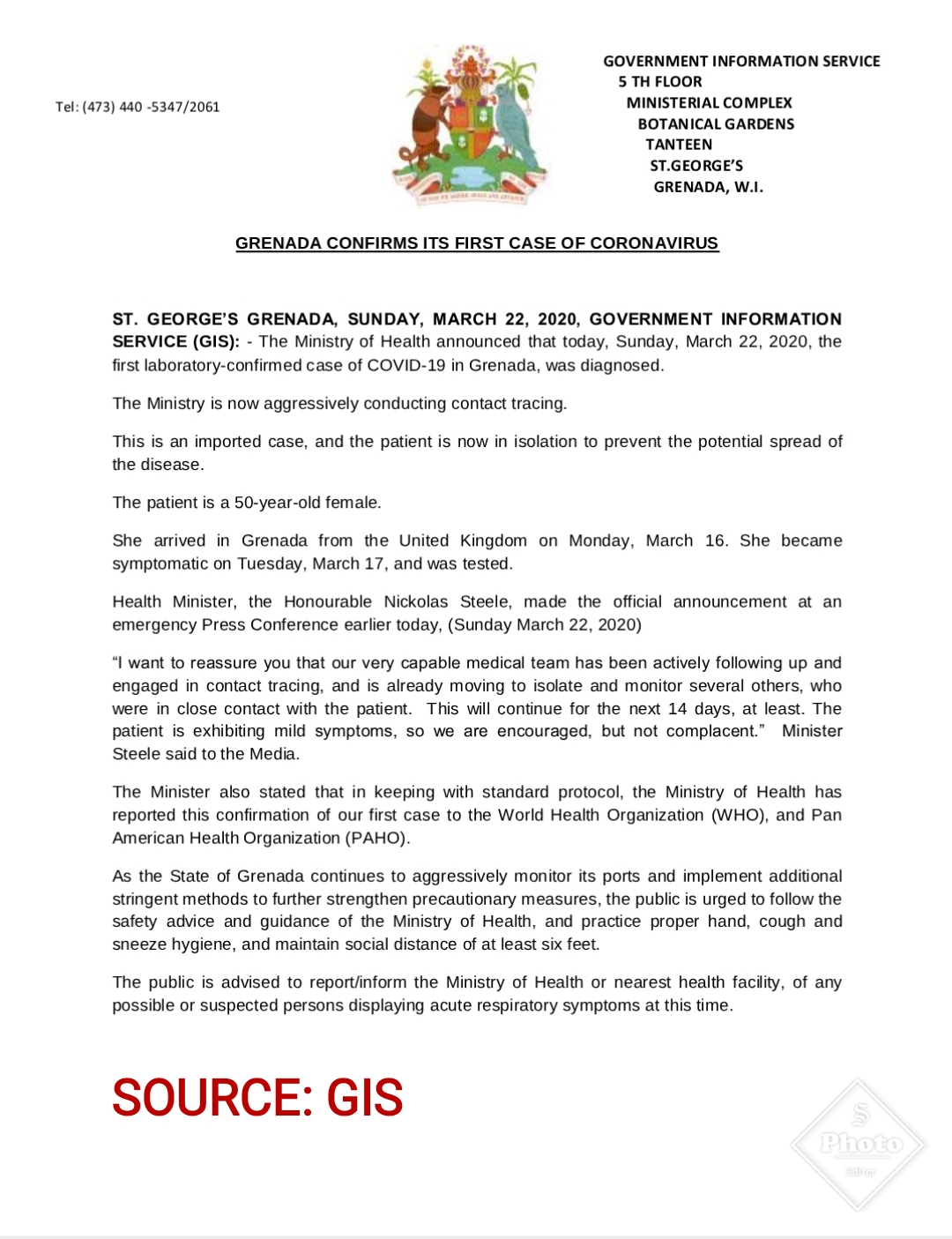 The imported COVID-19 case is a woman, a Grenadian national who arrived on the island from the UK on a Virgin Atlantic flight on Monday, March 16. “The ministry is engaged in contact tracing to identify people who may have come in contact with the infected woman and maybe showing symptoms of COVID 19,” minister Steel said.