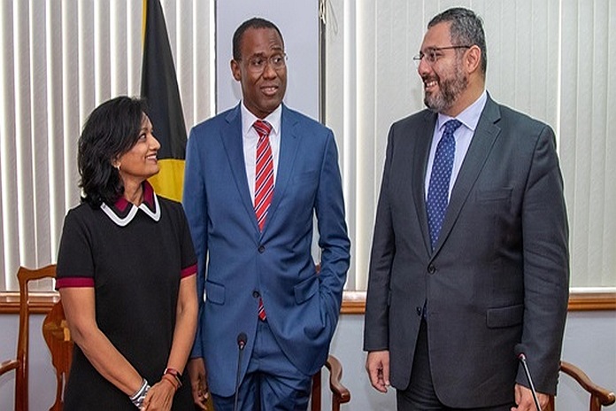 (From left to right: Former IMF Mission Chief for Jamaica, Uma Ramakrishnan; Jamaica’s Finance Minister, Nigel Clarke; and IMF resident representative, Karim Youssef)