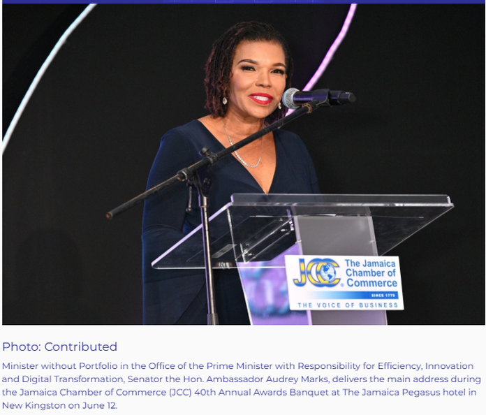KINGSTON, Jamaica, (JIS) – The private sector is being urged to lead the charge in boosting productivity, driving growth, and accelerating national development. This was the charge from minister without portfolio in the office of the prime minister with responsibility for efficiency, innovation and digital transformation, senator ambassador Audrey Marks, speaking during the Jamaica Chamber of Commerce (JCC) 40th Annual Awards Banquet on June 12, at The Jamaica Pegasus hotel in New Kingston.