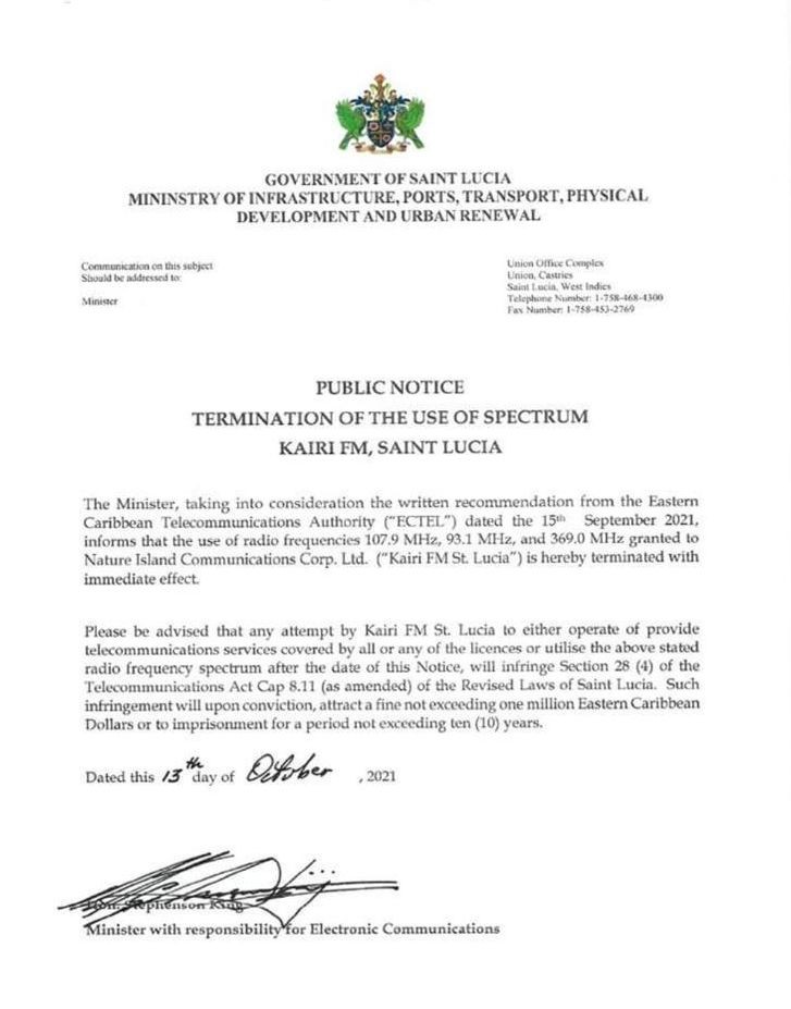 Kairi FM St Lucia Radio Frequencies 107.9, 93.1 and 369.0 MHz terminated