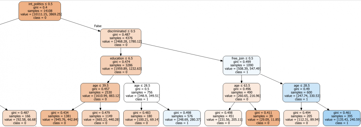 At this point, we had to go even further by introducing a more sophisticated nonlinear technique using decision trees. This is a machine learning technique that repeatedly divides the data within a given dataset into multiple groups; learns from the analysis of those data clusters; and based on that learning, develops an algorithm that captures relationships between variables like tree branches (see figure 1). Using this technique, we got a different outcome: while political trust is clearly a factor driving citizen participation, it is not the only factor, rather, it interacts with other significant factors in a complex nonlinear fashion.
