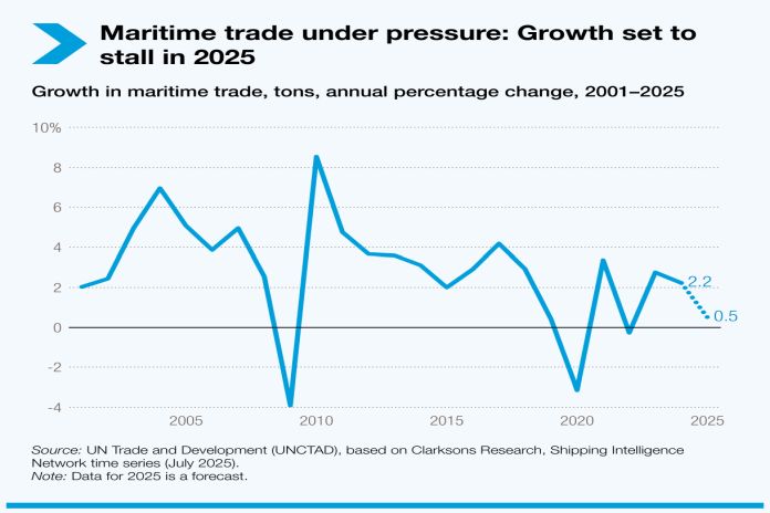 After a modest 2.2 percent growth in 2024, maritime trade is expected to slow to just 0.5 percent in 2025, according to the Review of Maritime Transport 2025, published on 24 September by UN Trade and Development (UNCTAD).
