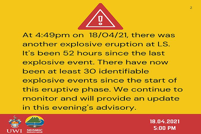 KINGSTOWN, St Vincent — La Soufriere volcano continues to erupt. Its pattern of seismic activity over the last few days is typical of the growth and destruction of lava domes. Explosions with accompanying ashfall, of similar or larger magnitude, can occur with little or no warning, says NEMO St. Vincent and the Grenadines.