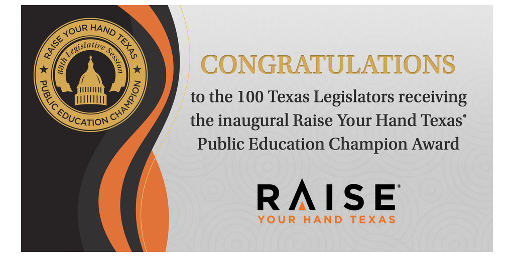 AUSTIN, Texas–(BUSINESS WIRE)–#TXEd–Throughout the 88th Legislative Session, many Texas legislators fought for the needs of Texas’ 5.4 million public school students and made decisions that were the very best for their communities and their schools. Raise Your Hand Texas is honoring the 100 Texas legislators who stood out for their outstanding achievement and steadfast commitment to public education with the inaugural Raise Your Hand Texas Public Education Champion Award.