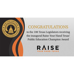 “When legislators are willing to go above and beyond for their public schools and the students and teachers in their local community they need to be recognized for their efforts,” said Dr. Michelle Smith, executive director at Raise Your Hand Texas. “Our Public Education Champion Award honors that steadfast commitment to the legislators’ local community when making decisions at our Texas Capitol.”