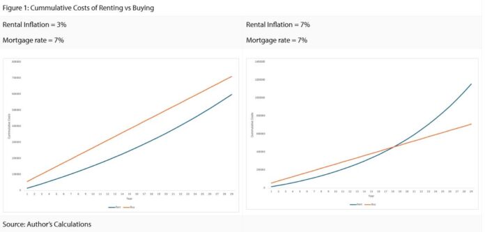 One of the most important determinants of whether to buy or rent is the rate at which rent is rising compared to your mortgage rate (Figure 1). If the rate of rental inflation is lower than the mortgage rate it makes sense to rent. In contrast, if the rate of rental inflation is the same as the mortgage rate, it makes sense to purchase your own home.