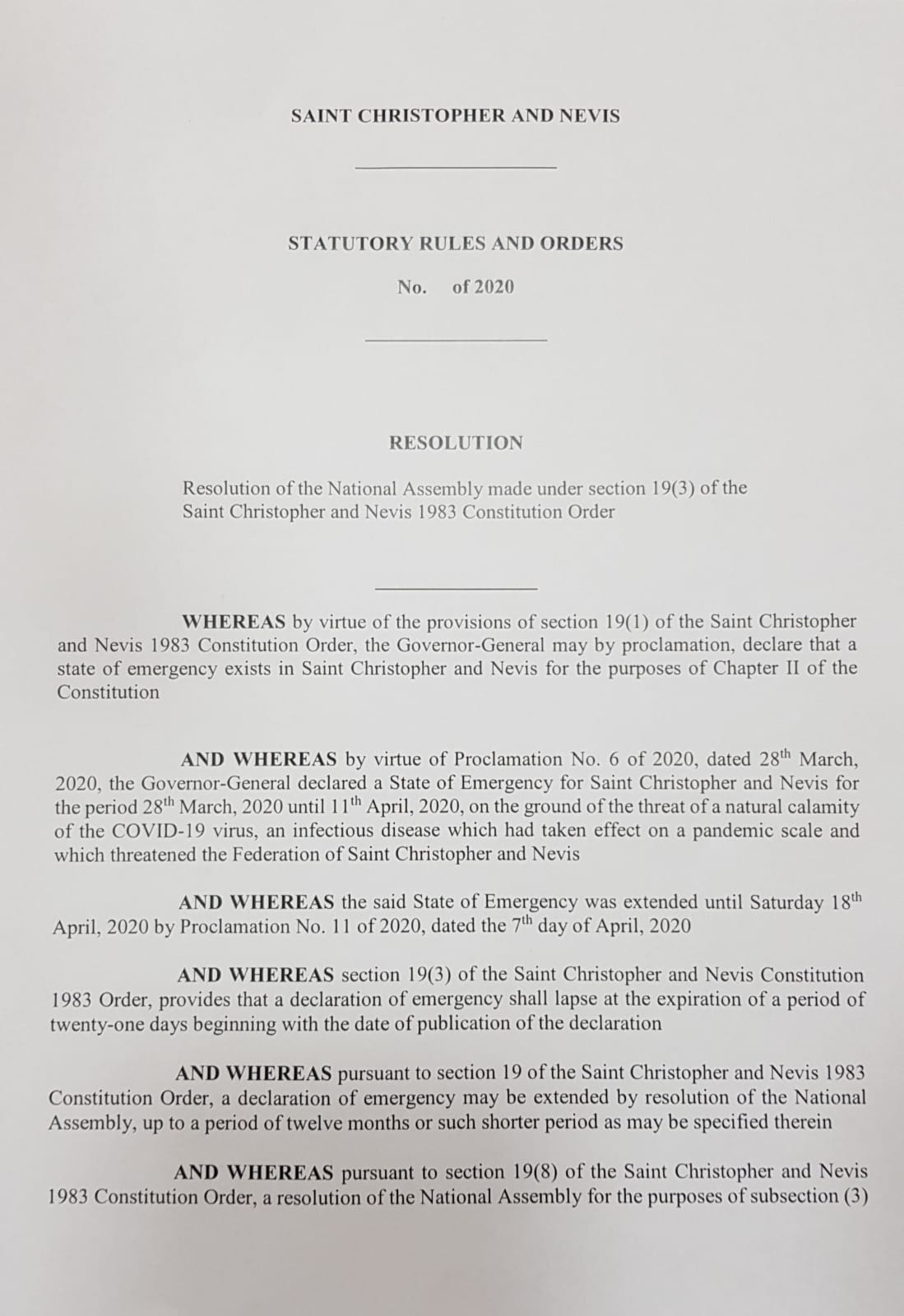 BASSETERRE, St Kitts – Prime minister Dr Timothy Harris on Friday, April 17, 2020, at an emergency sitting of parliament introduced a resolution “on the grounds that” the “COVID-19 virus continues to pose a significant threat of a natural calamity, on the scale of a public health urgency to the Federation of St Christopher and Nevis; and that it is, therefore, necessary to extend the State of Emergency up to 12 months.