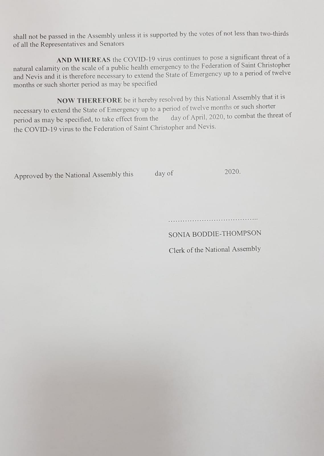 In total agreement with her St Christopher 3 (West Basseterre) colleague, Konris Maynard, a clause in the resolution which states that the duration of the State of Emergency is ‘up to a period of 12 months,’ is not in line with the wording which states ’12 months.’