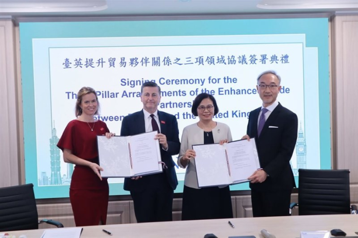 TAIPEI, Taiwan, (CNA) – Taiwan and the United Kingdom on Monday signed three agreements to enhance bilateral exchanges and cooperation in investments, digital trade, energy and net zero.