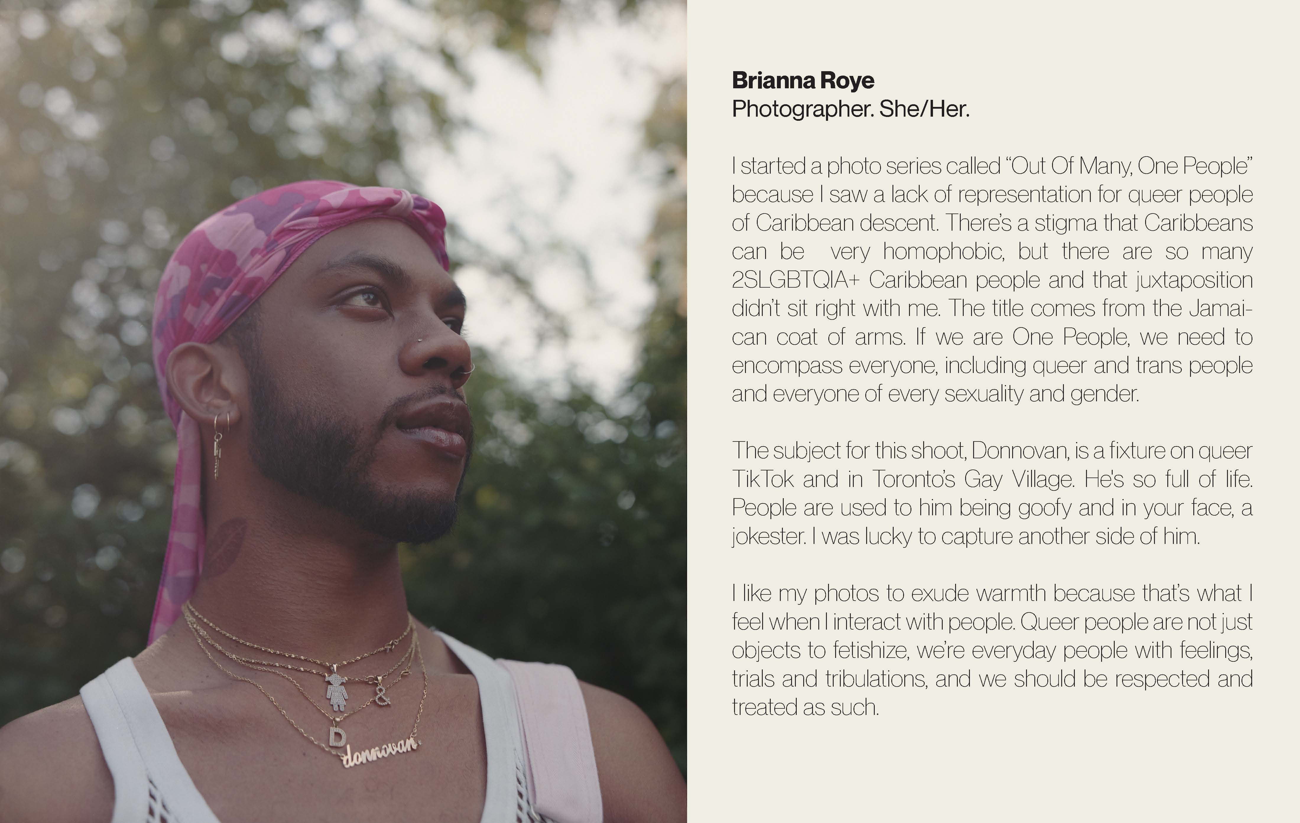 Brianna Roye is a Toronto-based photographer whose warm, intimate photos shine a light on her own community – 2SLGBTQIA+ folks of Caribbean descent. Roye, who is the daughter of Jamaican immigrants, started her signature series, “Out of Many, One People” after feeling left out of the queer media she grew up adoring. Shows like Queer as Folk and The L Word helped shape Roye as a queer woman, but she didn’t see anyone like her on screen. As a photographer, she’s created the images that were missing: beautiful and reflective shots of subjects from across the Caribbean diaspora who are out, proud and full of queer joy.