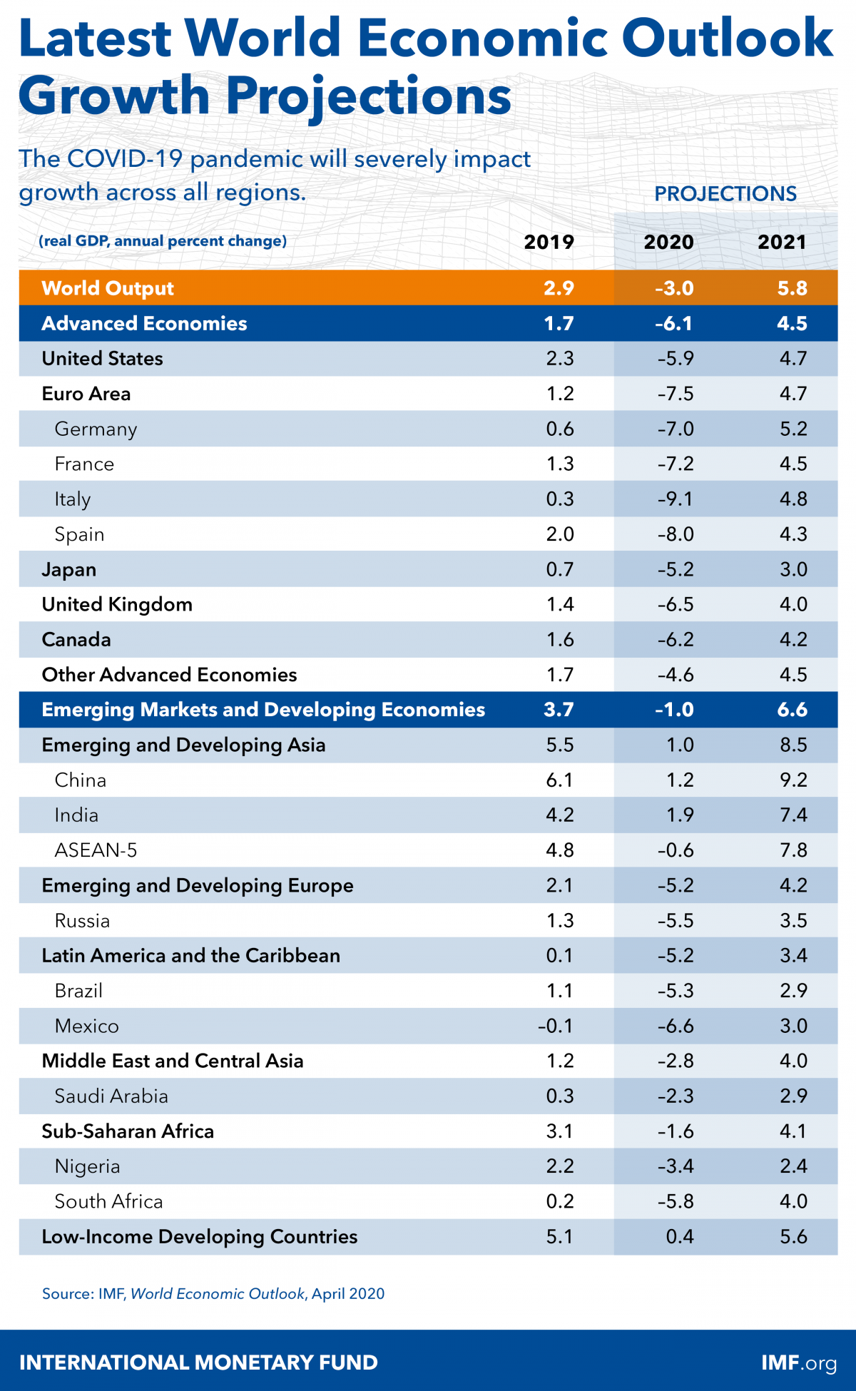 For the first time since the great depression both advanced economies and emerging market and developing economies are in recession. For this year, growth in advanced economies is projected at -6.1 percent. Emerging market and developing economies with normal growth levels well above advanced economies are also projected to have negative growth rates of -1.0 percent in 2020, and -2.2 percent if you exclude China. Income per capita is projected to shrink for over 170 countries. Both advanced and emerging market and developing economies are expected to partially recover in 2021.