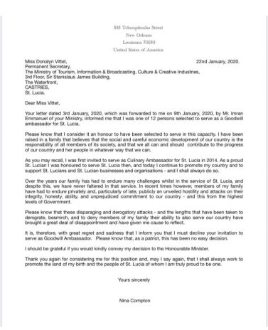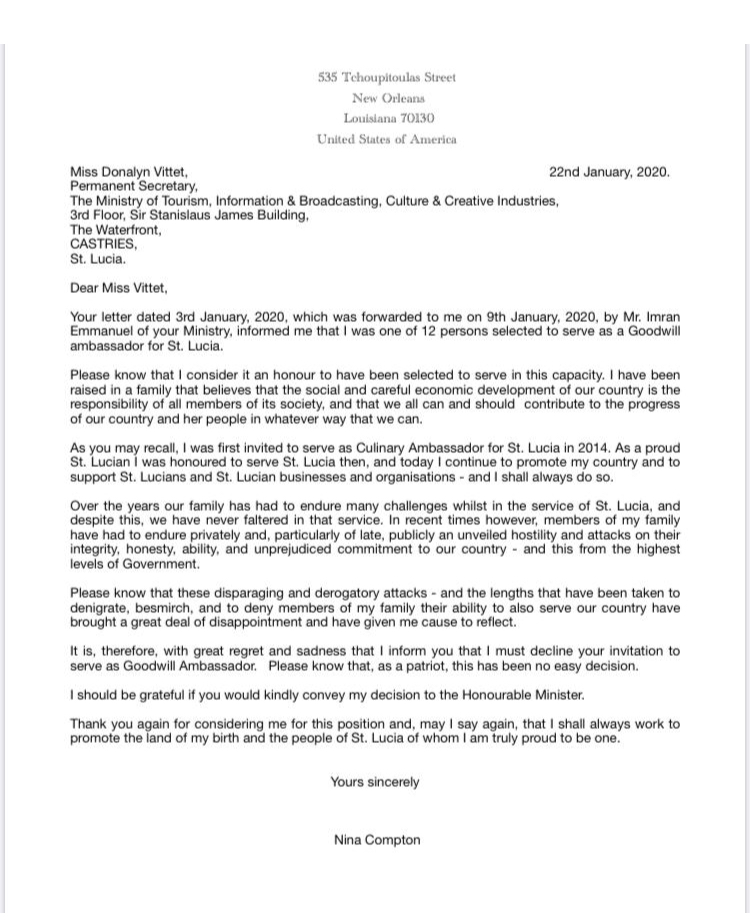 Below is the well-distributed letter from Nina Compton to informed the government of Saint Lucia that: “ I must decline your invitation to serve as Goodwill ambassador.”