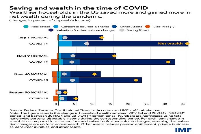 - This overall increase in net wealth was also unevenly distributed, with much of it accruing to people at the top of the distribution. Indeed, the equity price boom mostly benefitted the rich, while lockdowns more heavily affected spending on dining and travel, which make a larger part of wealthier households’ consumption habits. Additionally, government support, in the form of direct stimulus or support to firms, also benefitted the saving of wealthier households compared to poorer households that were more likely to spend the extra cash.