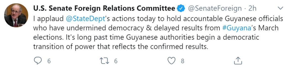 US Senate Foreign Relations Committee also endorsed the actions taken by the US Department of State on Wednesday against senior officials of the David Granger-led administration, expressed on Twitter: