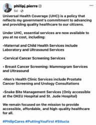 UWP SOS-7 includes: ● Remove the 2.5% levy ● Reduce gas prices within 30 days ● Introduce National Health Insurance Coverage for all (75,000 coverage) ● Introduce free tertiary education at SALCC● Pay pension to banana farmers who did not pay NIC ● Remove the Dam Dredging fee for residents of the south ● Reintroduction of Border Control and Expansion of the K-9 unit.