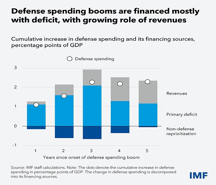 The reliance on deficit financing can stimulate the economy in the short term, but strain fiscal sustainability over the medium term, particularly in countries with limited room in government budgets. Deficits worsen by about 2.6 percentage points of GDP, and public debt increases by about 7 percentage points within three years of the start of a boom (14 percentage points in wartime). The resulting increase in public debt can crowd out private investment and offset the initial expansionary effect of defense spending.