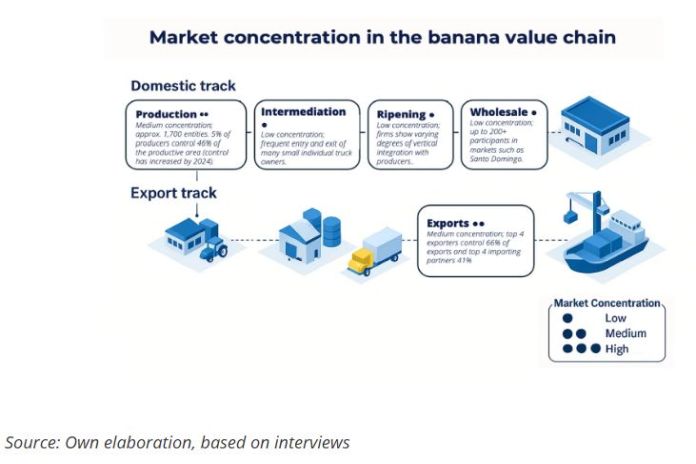 In the Dominican Republic, bananas also follow dual mechanisms. Fruit destined for the international market is priced through annual contracts benchmarked to certified quality and sustainability standards; fruit destined for the domestic market moves via fragmented intermediation, with prices driven by daily conditions and limited differentiation by production practices.