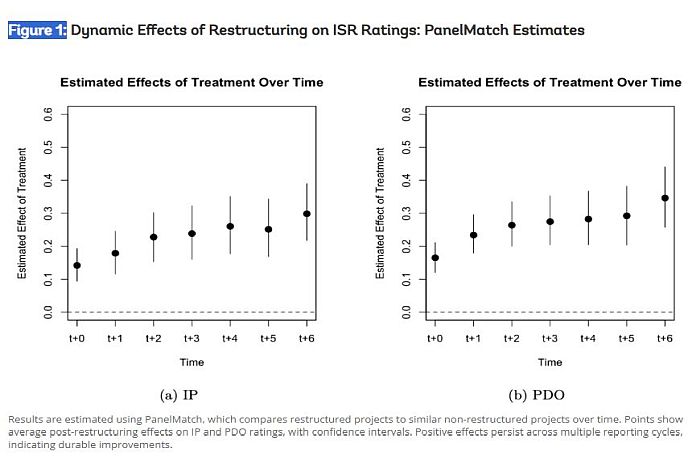 The results are striking. On average, projects show clear and persistent improvements in ISR ratings after restructuring, both for implementation progress (IP) and project development objectives (PDO). These gains are not fleeting; they persist across multiple reporting cycles (see Figure 1).