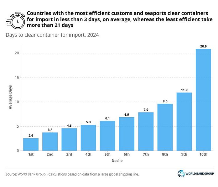 The Connecting to Compete 2025 report released today shows that advanced economies tend to have short or moderate dwell times while some middle-income economies that have invested heavily in port infrastructure, such as India and Indonesia, also perform well. In contrast, performance is more uneven in low- and lower middle-income economies, with the longest delays concentrated in parts of Sub-Saharan Africa and the Middle East and North Africa, where dwell times can often exceed two weeks.