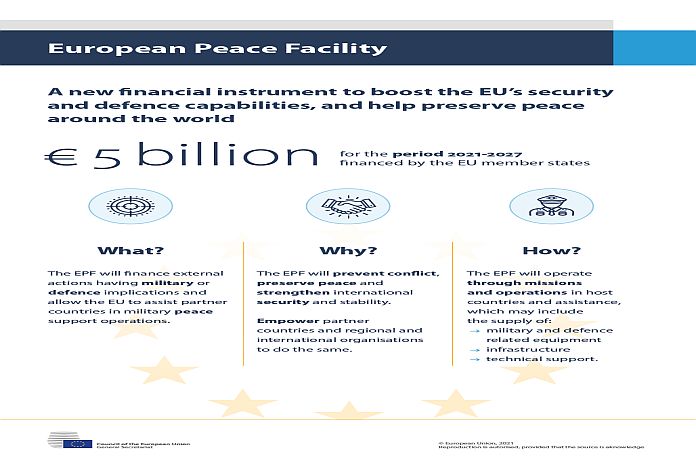 The Council on Monday, adopted a decision establishing the European Peace Facility (EPF), an off-budget fund worth approximately €5 billion for the period 2021-2027, to be financed through contributions from EU member states.