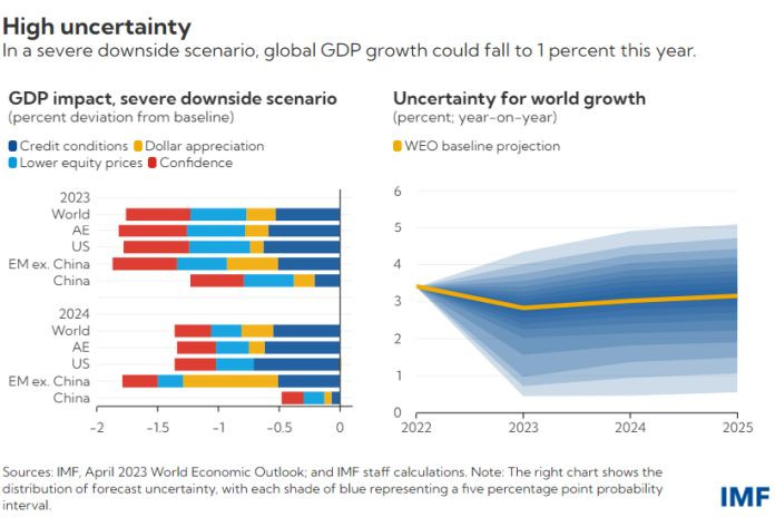 Our World Economic Outlook explores a scenario where banks, faced with rising funding costs and the need to act more prudently, cut down lending further. This leads to an additional 0.3 percent reduction in output this year.