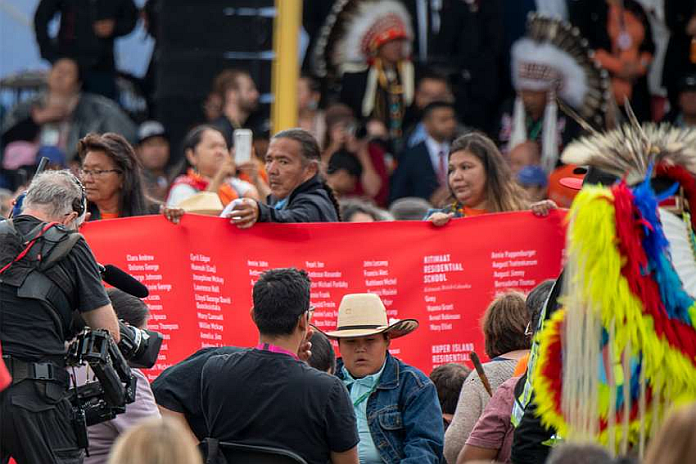 MASKWACIS, Alta – The words “I am sorry” are powerful. For Tammy Ward of the Samson First Nation, those words from Pope Francis brought tears as she listened on the Maskawacis powwow grounds.