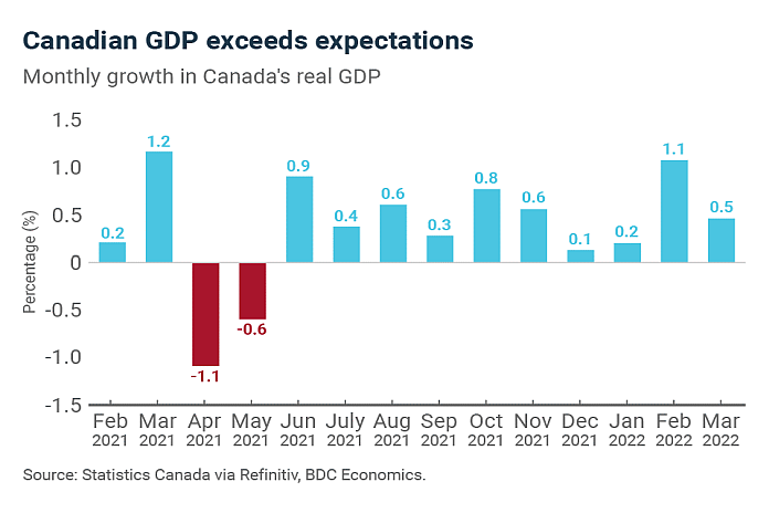 Preliminary estimates from Statistics Canada suggest a 0.5 percent increase in March, indicating strong growth for the first quarter. Monthly growth of this magnitude would mean annualized growth of 5.6 percent, well above the Bank of Canada’s forecast of 3.0 percent.