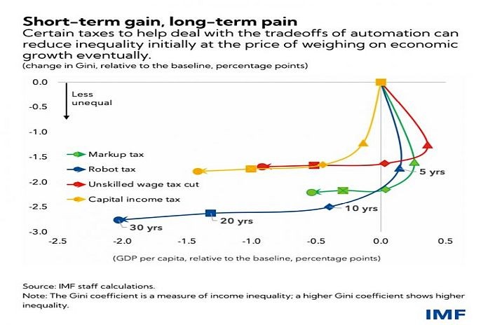 We found the effects and trade-offs are very different in the short term vs. the long run. In the short term, three policy packages (excluding the capital income tax) deliver modest output-per-capita gains and a sizable reduction in inequality. However, as time passes, capital accumulation and productivity begin to lag. The robot tax is the most powerful tool to reduce inequality, as it slows down the replacement of low-skilled labor by robots, but the flip side of this is slower accumulation of highly productive robots and forgone output. Similarly, a tax cut of wages of unskilled workers both reduces inequality and raises output in the short run, while the larger share of unskilled labor (less productive than robots) weighs on the productivity in the long run.