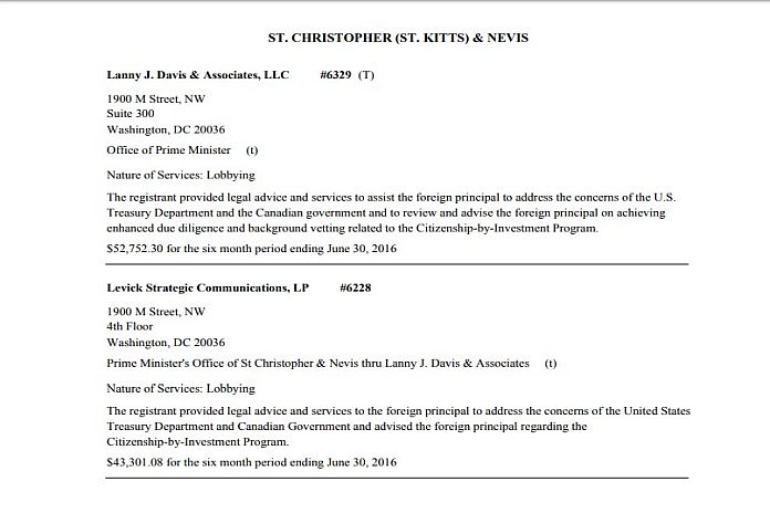 Both payments received from the office of the prime minister of St Kitts and Nevis and were filed in compliance with the US attorney general’s FARA (Foreign Agents Registration Act) report to the United States Congress.