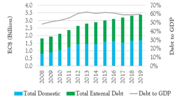 Saint Lucia’s debt as its stand, increased in 2018 – 2019 to reflect $3.4 billion and approximately 59.3 percent debt to GDP ratio rebased. Outside of the rebased trend, it would have been a historical trajectory 74 percent debt to GDP ratio for the period 2020. The 59.3 ratio allows a revised status but a very narrow window of (0.7) to operate from and to maintain IMF conditionality.