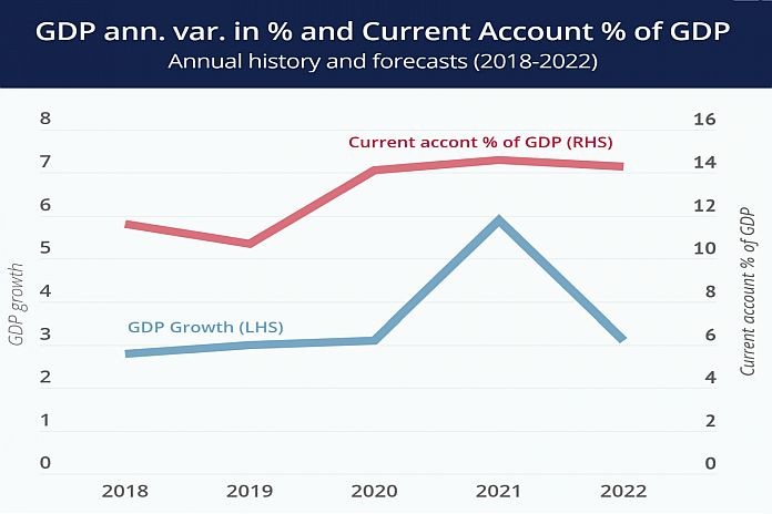 FocusEconomics Consensus Forecast panelists expect GDP growth to reach 5.9 percent in 2021, before slowing to 3.1 percent in 2022. Moreover, our panel of analysts see the current account balance reaching 14.6 percent of GDP in 2021 and 14.3 percent in 2022.