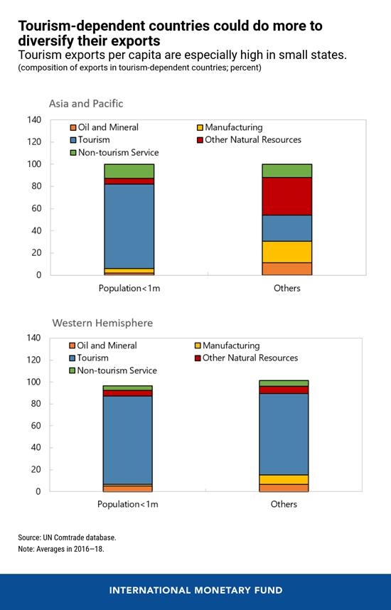 Finally, should the reduction in travel be longer-lasting, owing to changes in tourist preferences or economic scarring, some tourism-dependent countries may need to embark on a long and difficult journey to diversify their economies. Investing in non‑tourism sectors is a long-term goal but could be aided by strengthening links between tourism and locally produced agriculture, manufacturing, and entertainment. In Jamaica, for instance, an online platform was launched that allows buyers in the hotel industry to directly purchase goods from local farmers. Exports, including services, could also be expanded, using regional agreements to address the constraints imposed by limited economies of scale.