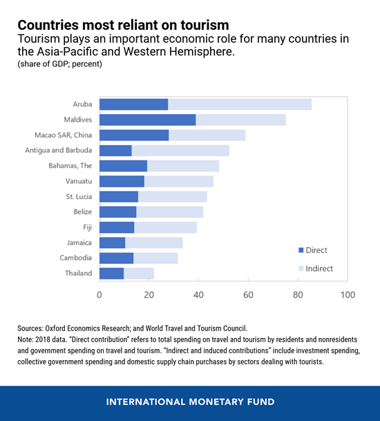 For many developing countries in the Asia-Pacific and Western Hemisphere—small island states in particular—the effects have been severe. Before the pandemic hit, tourism was big business, accounting for more than 10 percent of global GDP. The share was even larger in tourism-dependent countries.